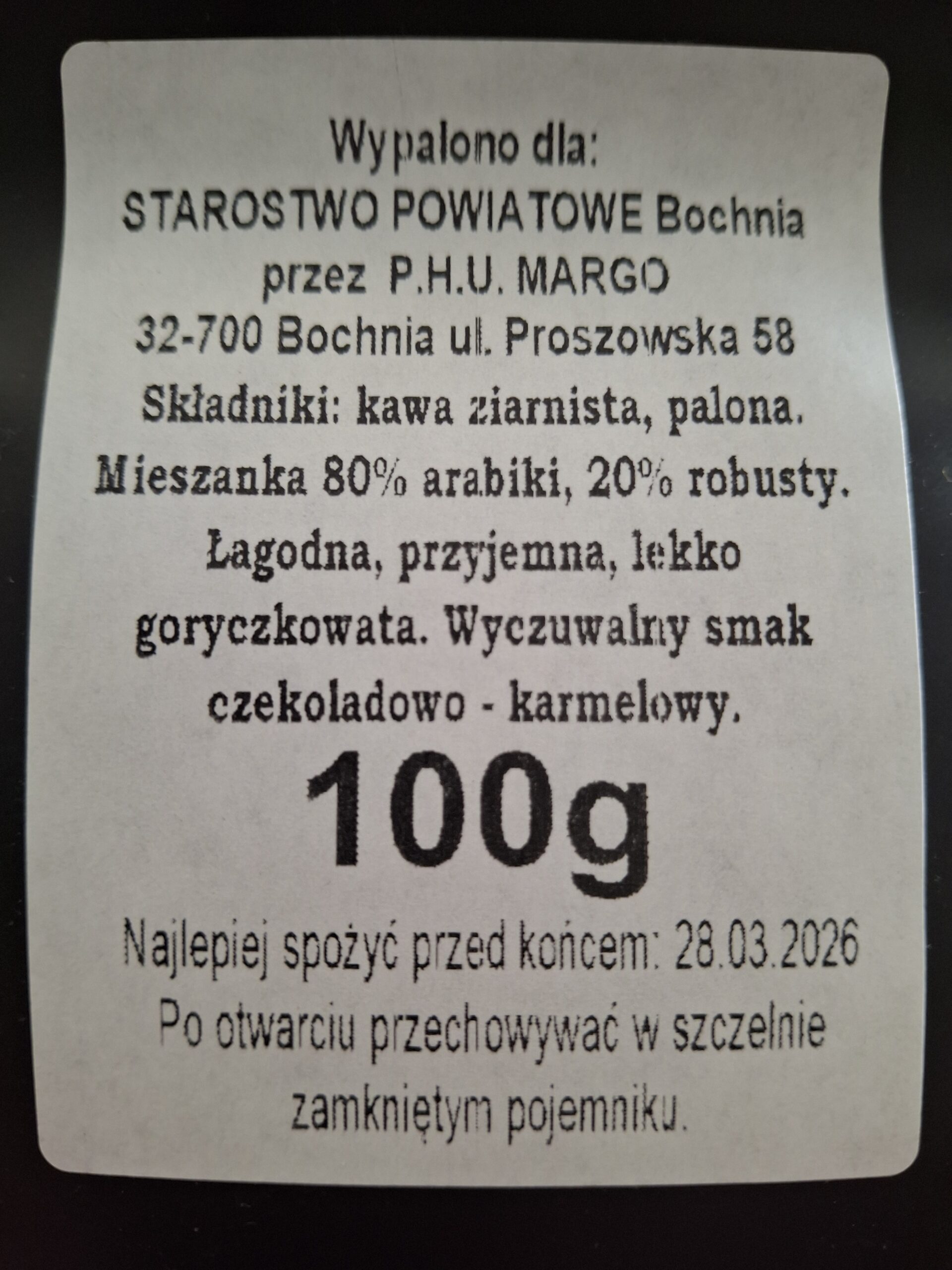 • Przygotowana i wypalona specjalnie dla Starostwa Powiatowego Bochnia przez palarnię kawy Planeta Kawy