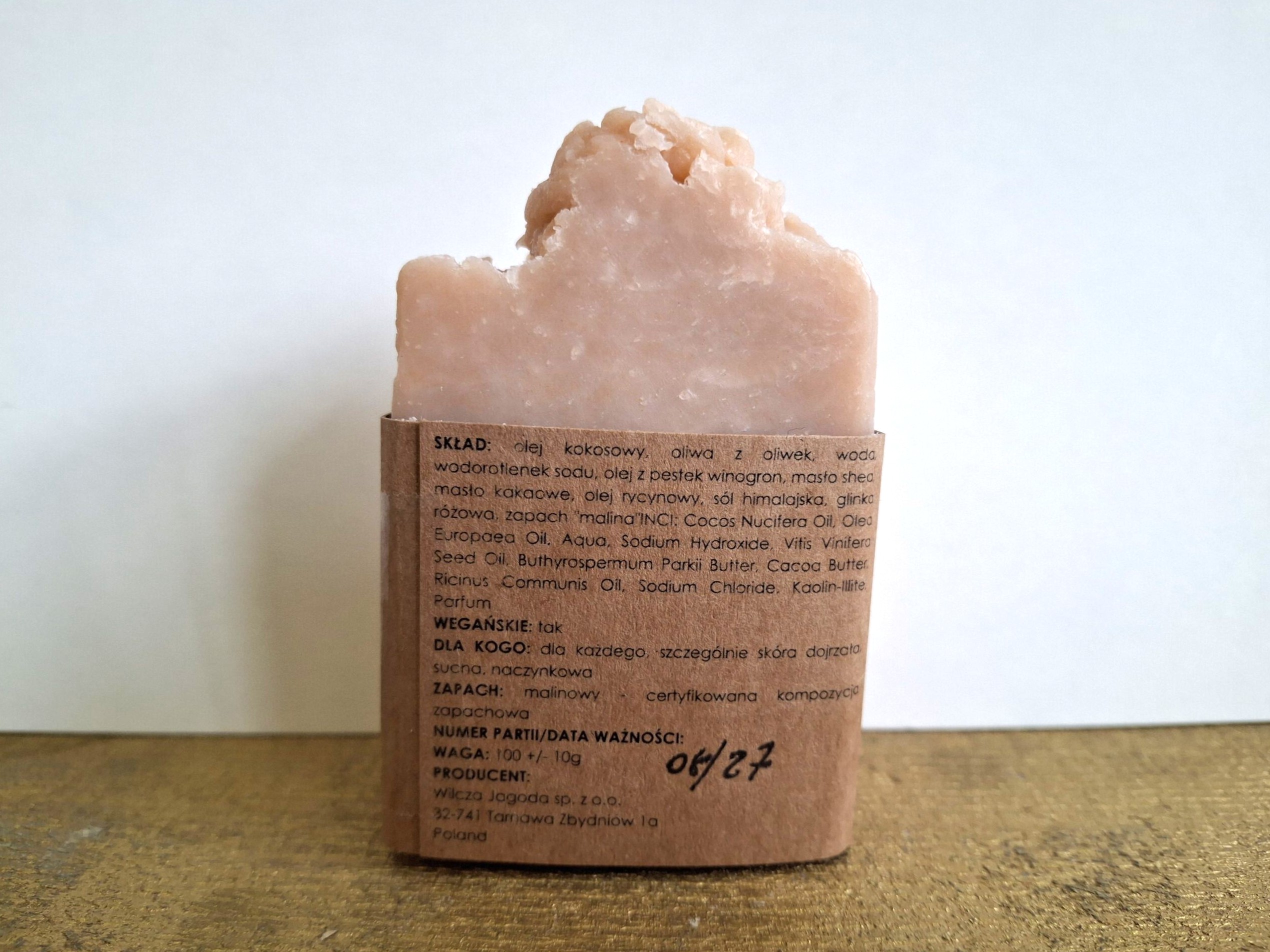 • Skład: zmydlone: olej kokosowy, oliwa z oliwek, woda, wodorotlenek sodu, olej z pestek winogron, masło shea, masło kakaowe, olej rycynowy, sól, glinka różowa, zapach „malina”INCI: Cocos Nucifera Oil, Olea Europaea Oil, Aqua, Sodium Hydroxide, Vitis Vinifera Seed Oil, Buthyrospermum Parkii Butter, Cacoa Butter, Ricinus Communis Oil, Sodium Chloride, Kaolin-Illite, Parfum