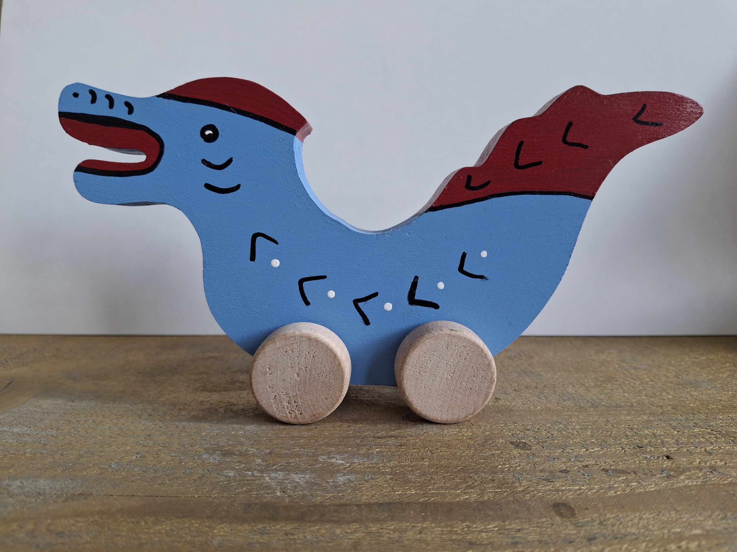 • Smok Wawelski na kółkach, drewniany, ręcznie rzeźbiony